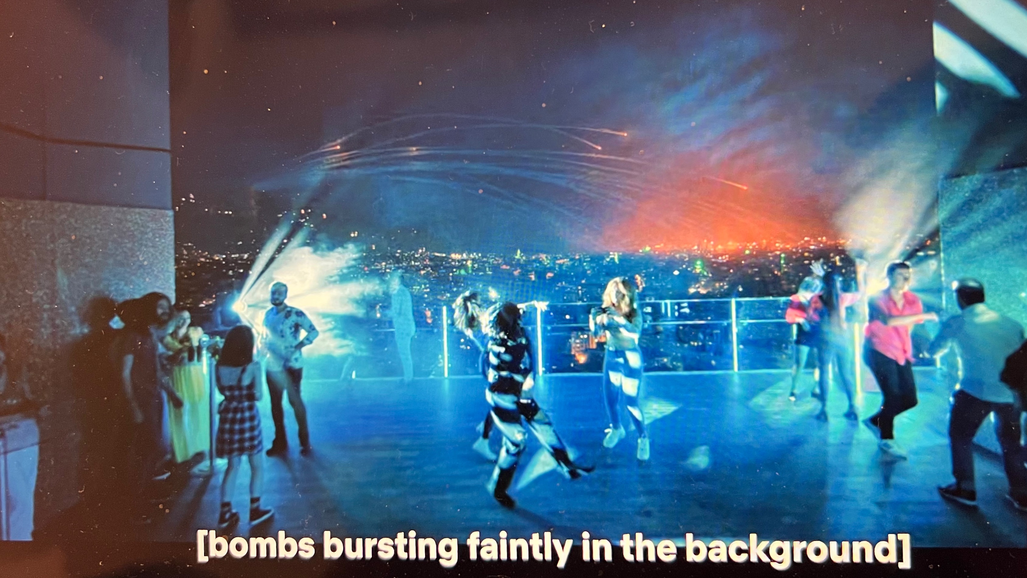 1. 루프탑 파티에서 자유롭게 춤을 추는 유스라와 새라, 그때 흘러나오는 노래 Titanuim은 자유를 만끽하는 자매의 흥을 극대화 한다. 노래의 클라이막스에서 함께 터지는 루프탑 너머의 폭탄들은 전율이 돋을만큼 대조되며 죄책감이 들만큼 아름답다.