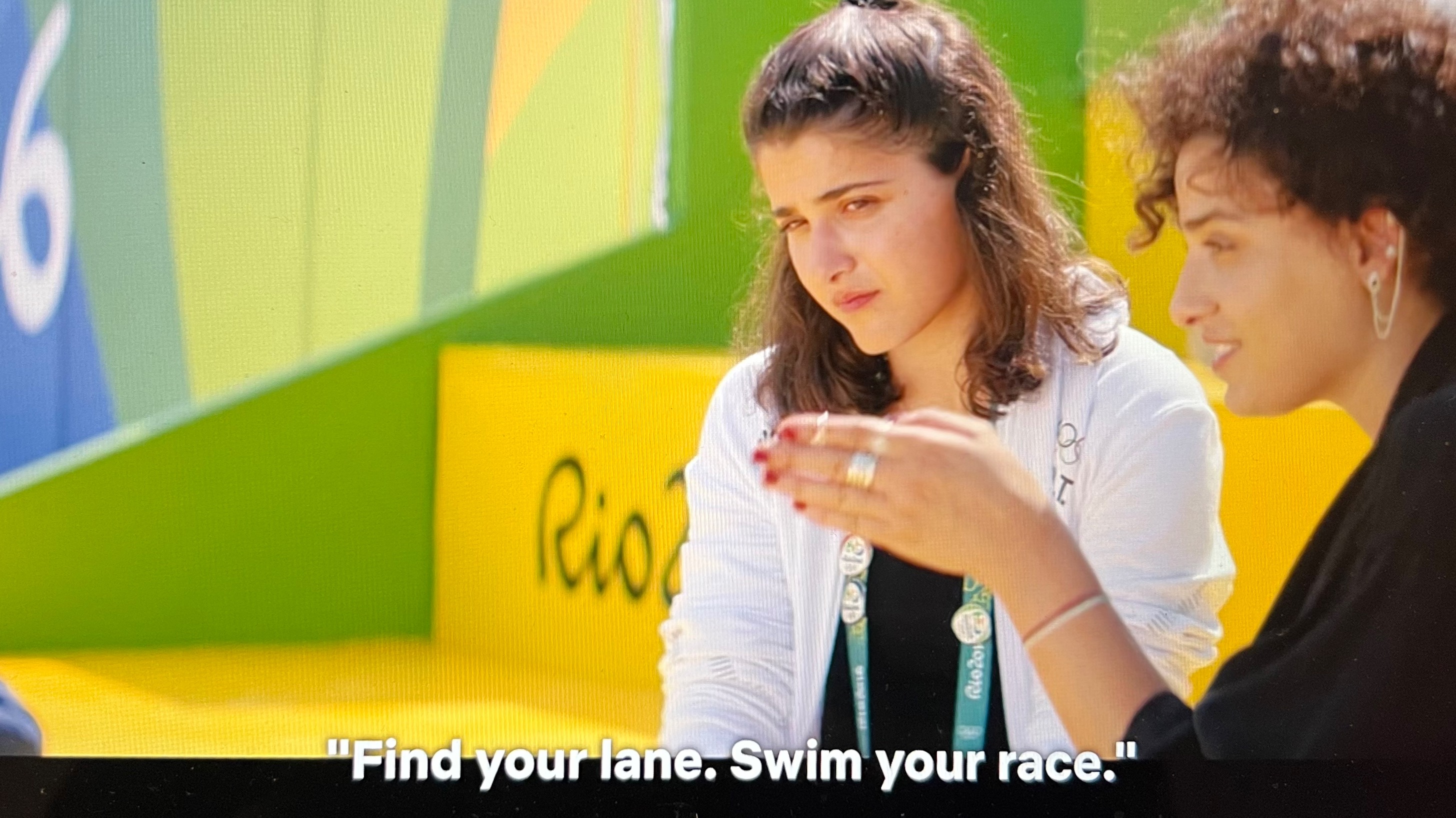 4. 다른나라 올림픽 참가자들의 따가운 시선을 받은 유스라에게 동기를 부여하는 새라, 그리고 인용되는 아버지의 가르침 "Find your lane, Swim your race"